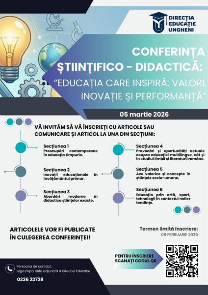 Direcția Educație Ungheni are plăcerea de a vă invita la un eveniment de referință, dedicat excelenței în educație, schimbului de bune practici și inovației didactice – 𝗖𝗼𝗻𝗳𝗲𝗿𝗶𝗻𝘁̦𝗮 𝘀̦𝘁𝗶𝗶𝗻𝘁̦𝗶𝗳𝗶𝗰𝗼-𝗱𝗶𝗱𝗮𝗰𝘁𝗶𝗰𝗮̆ „𝗘𝗱𝘂𝗰𝗮𝘁̦𝗶𝗮 𝗰𝗮𝗿𝗲 𝗶𝗻𝘀𝗽𝗶𝗿𝗮̆: 𝘃𝗮𝗹𝗼𝗿𝗶, 𝗶𝗻𝗼𝘃𝗮𝘁̦𝗶𝗲 𝘀̦𝗶 𝗽𝗲𝗿𝗳𝗼𝗿𝗺𝗮𝗻𝘁̦𝗮̆”.